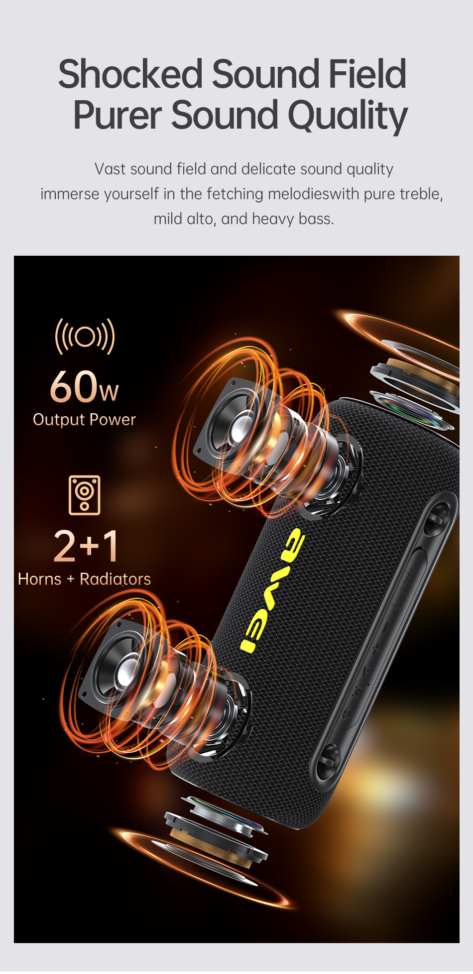 - Output Power: High-quality stereo sound with deep bass